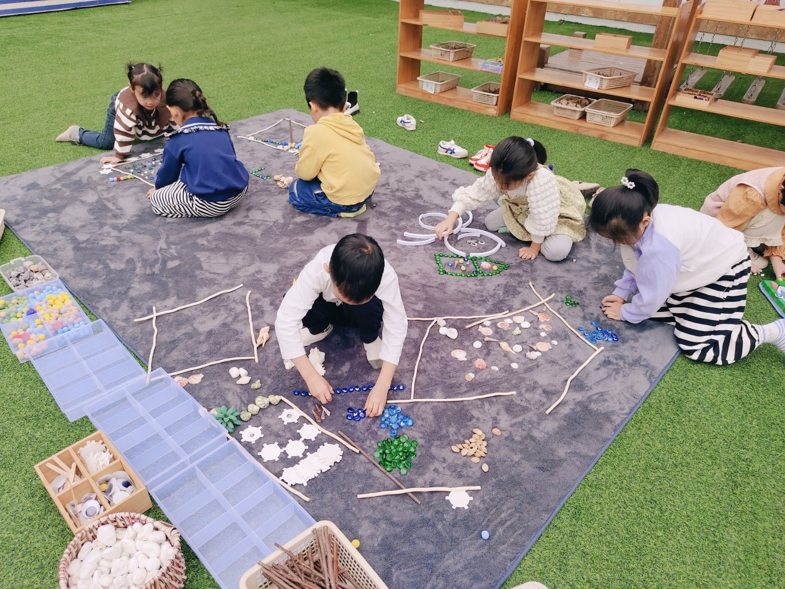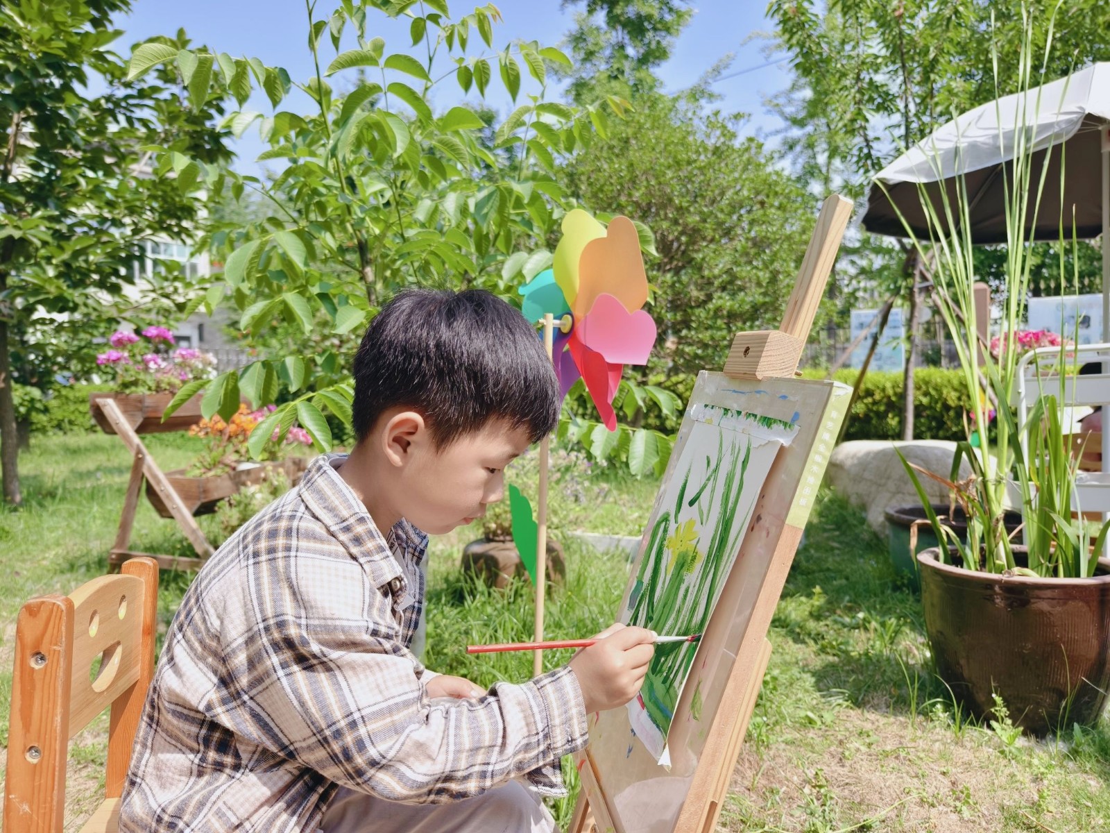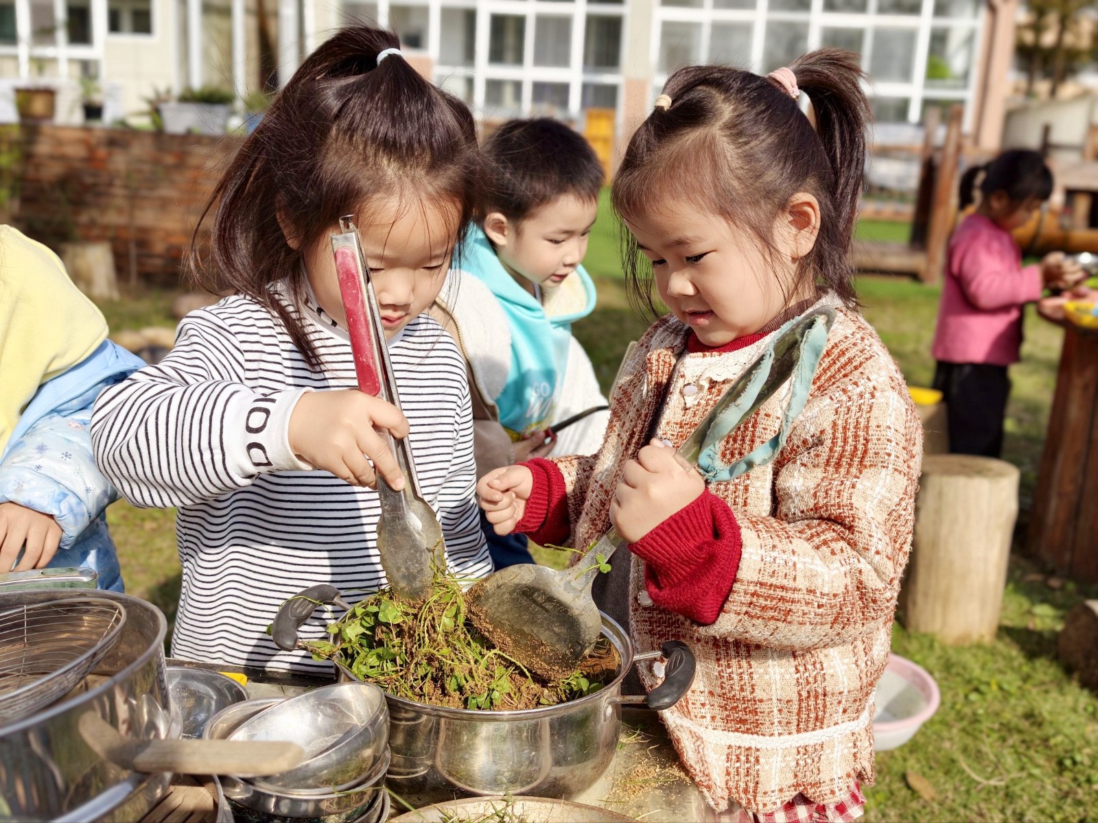 南楼运动区里,孩子们打篮球、跳马、攀爬,尽情释放活力;建构区中,他们分工协作动手创作,在实践中锻炼能力;茅草屋则是孩子们体验做饭的专属空间,大家沉浸式参与简易烹饪体验,感受动手劳作的乐趣;果园内,孩子用画笔绘画春天,在自然中舒展身心;骑行区里,小巧的车辆载着孩子们穿梭,在运动中培养品质;创意拼搭区,孩子们用自然物将创意变为实物,想象力得到充分发挥。每一处场景都藏着孩子们健康成长的印记。